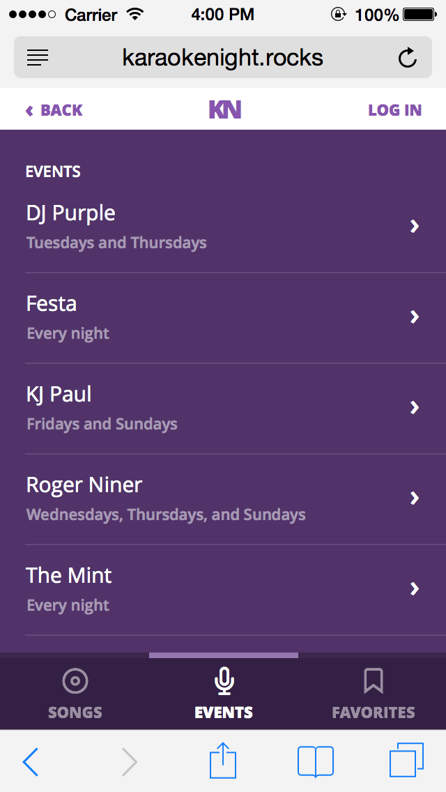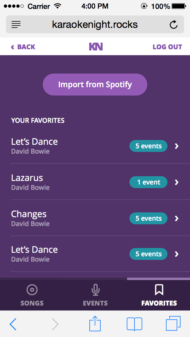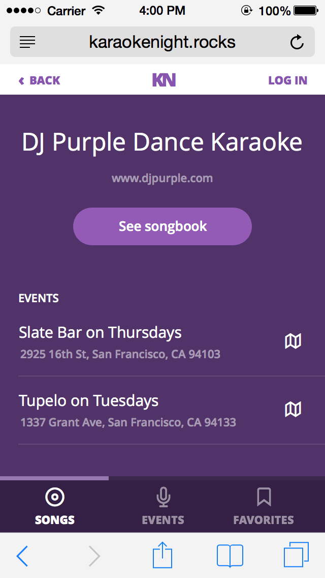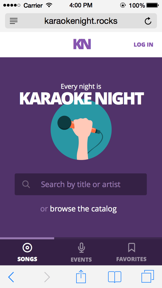 KaraokeNight is a mobile web app that helps you build a karaoke repertoire and match the songs you want to sing against Karaoke songbooks near you. As an avid karaoke enthusiast, I'm always trying to find new songs and new places to sing — so when prompted to build a project as the capstone to Bloc.io's front-end development course, Karoke Night seemed like just the thing.