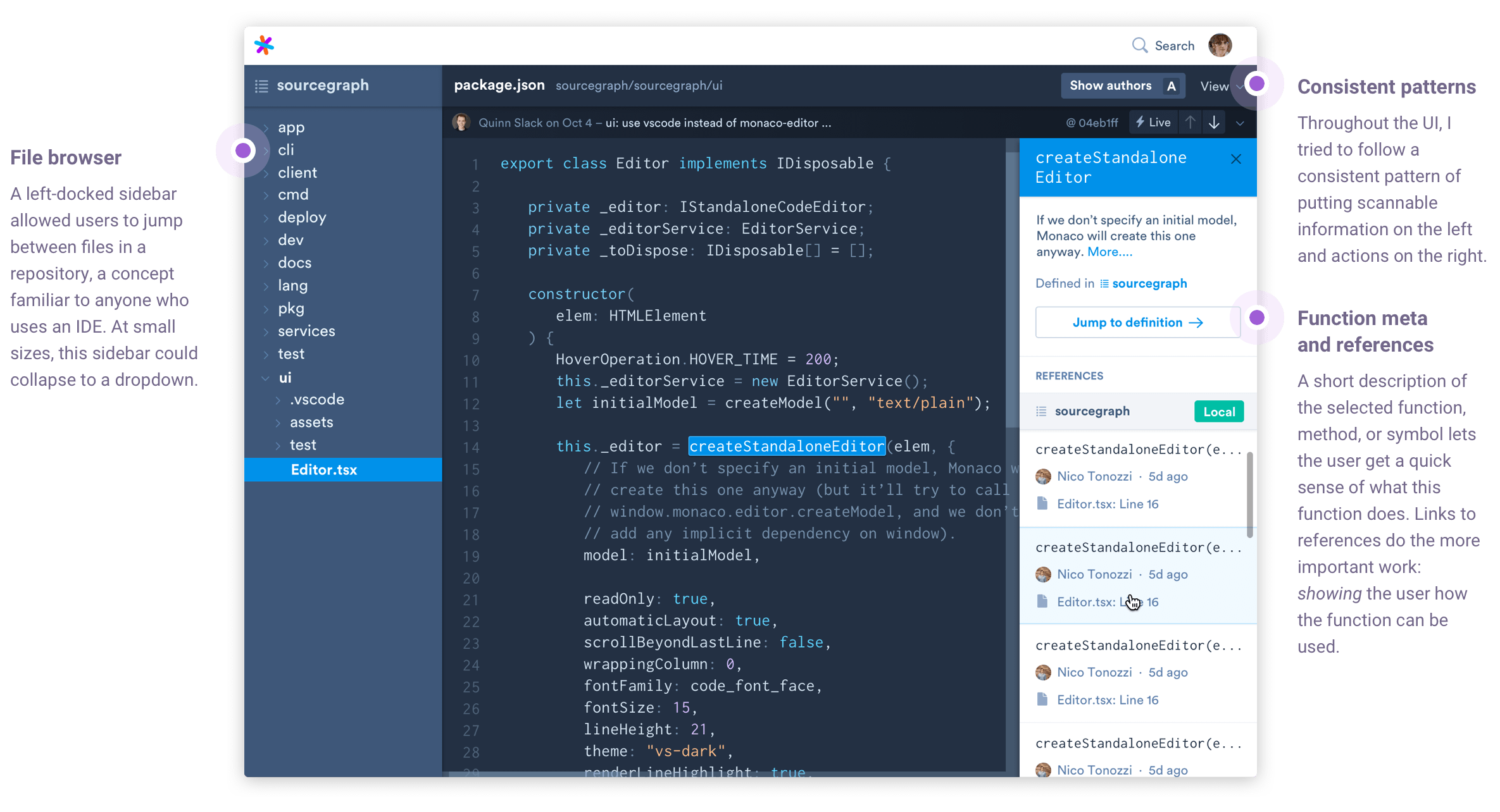 Sourcegraph's goal is to make programmers more efficient by making code easier to browse and understand. During a product sprint and under the direction of our Director of Product, I designed and helped implement a code view that attempts to answer two key questions: What does this code do and how should I use it?