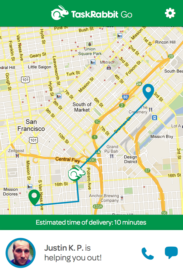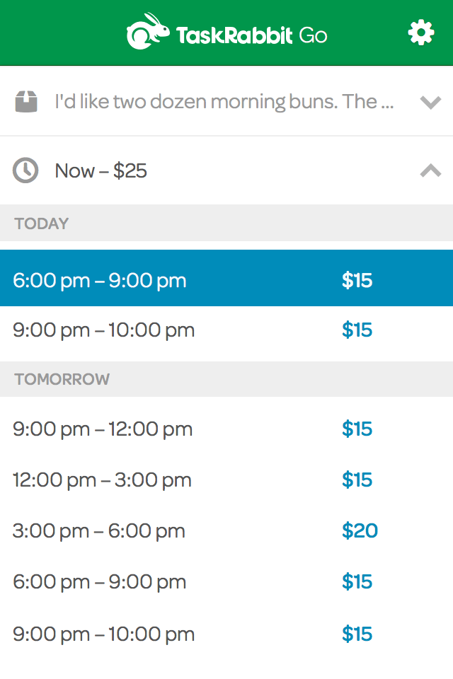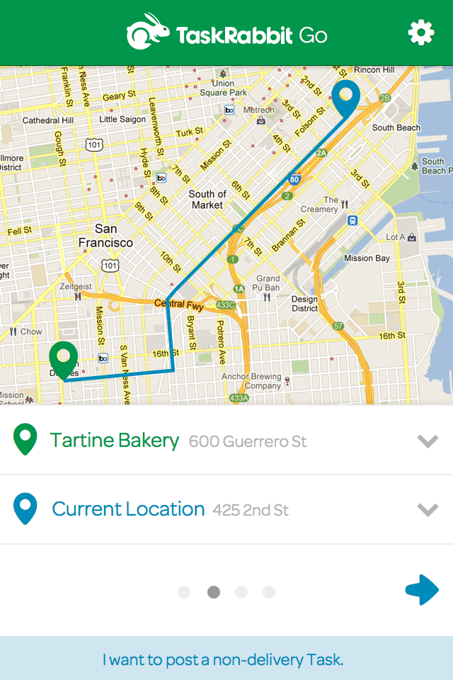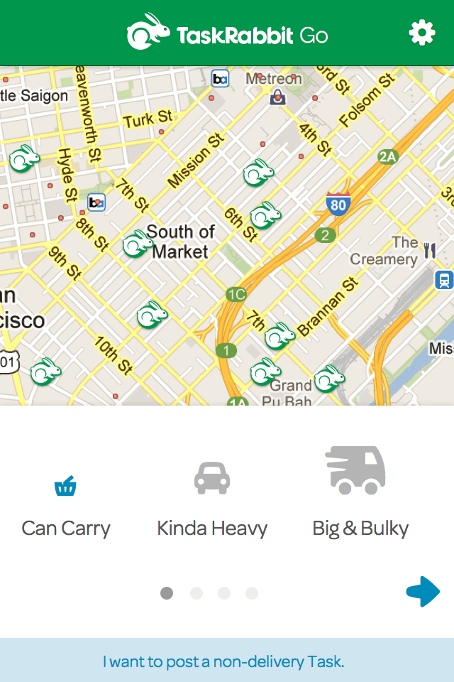 Some sample screens from the mobile web version of TaskRabbit Deliveries (previously TaskRabbit Go). A customer can request a delivery, choose a price and timeslot, and then track their delivery as it's on it's way.