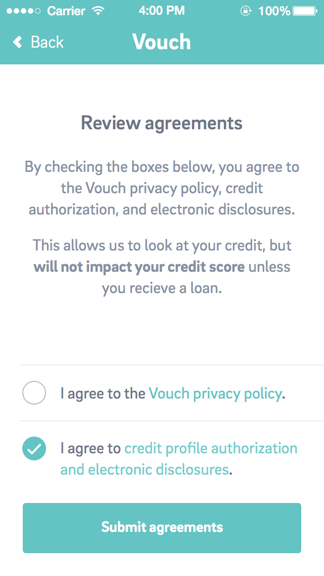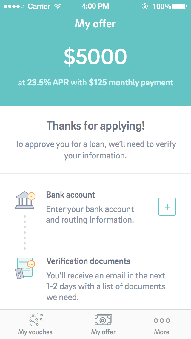 Vouch's desktop and mobile web experience is the main point of entry for the majority of our prospects. We discovered early on that until a borrower has an active loan, a native application doesn't provide much value to them. While we initially planned on mobile usage being a native experience, we soon realized it would be more valuable to focus on a responsive web experience.