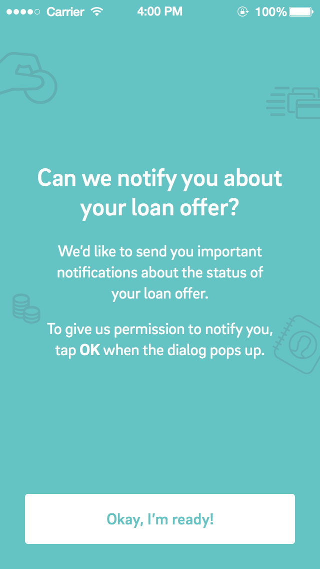 A few key screens from the prospect flow of the iOS app. This flow focused on bringing a prospect through sign up and loan application flow while encouraging customers to enable push notifications.
