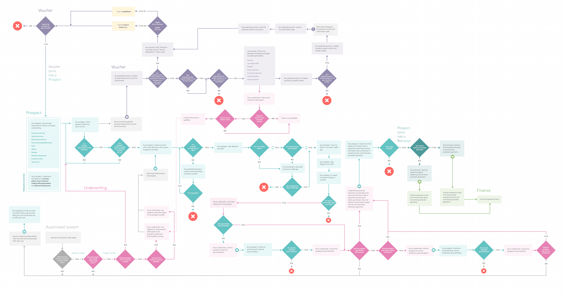 This more complex flow shows the interaction between different customers in the Vouch ecosystem: prospects, borrowers, sponsors, and internal staff. We used this as a tool to prioritize features, educate new employees, and solve design problems. A full size version is not available. If you'd like to see it, please contact me.