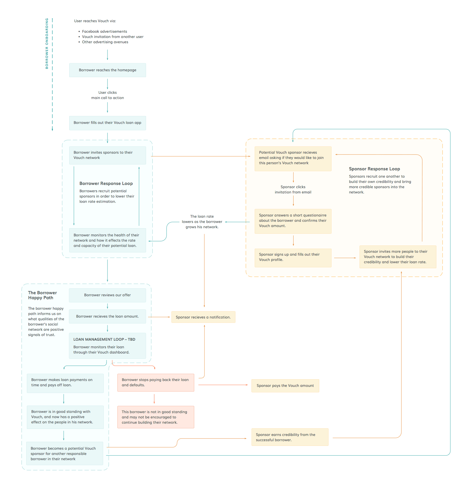 This visualization focused on identifying the main user flows and reward loops we wanted to create to promote viral growth. Ideally, happy sponsors and borrowers would recognize Vouch as valuable method for getting affordable credit and grow their own personal networks, exposing Vouch to an ever increasing number of customers.