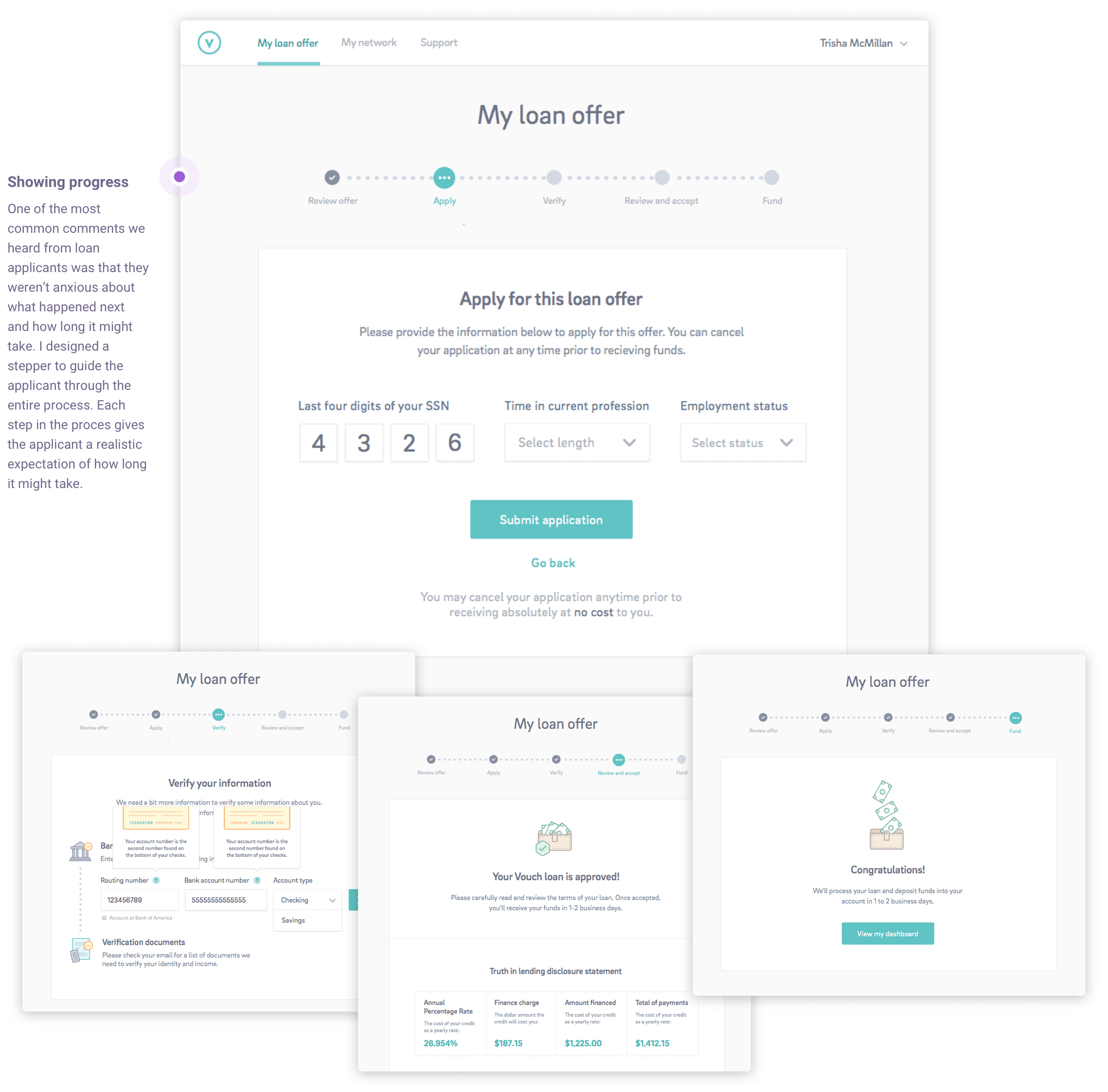 This series of screens brought a user from applying for their loan all the way to a funded loan. I worked closely with legal and finance to create a usable, web-friendly version of a promissory note — a document with strictly regulated standards that most lenders deliver as a PDF or piece of paper.